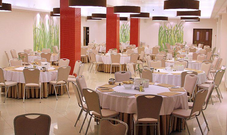 Большой современный зал столовой располагает приятно и комфортно провести время, насладиться здоровой и вкусной кухней. Для тех, кто проживает в номерах люкс, предусмотрен отдельный зал. Также каждый отдыхающий может посетить кафе «Пирс», летнюю площадку или заказать дополнительные блюда в номер.