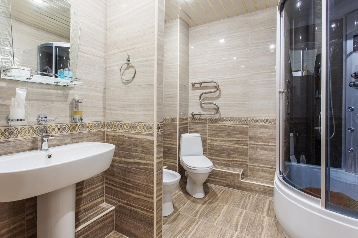 Санузел: унитаз, раковина, душевая кабина, фен
