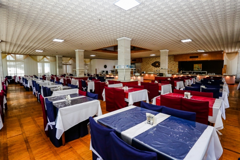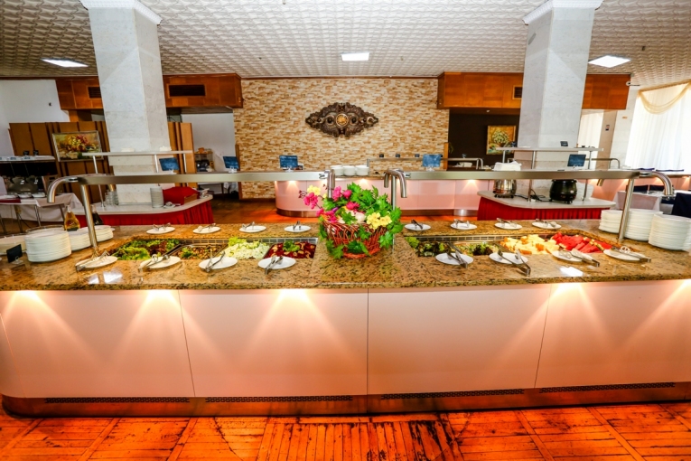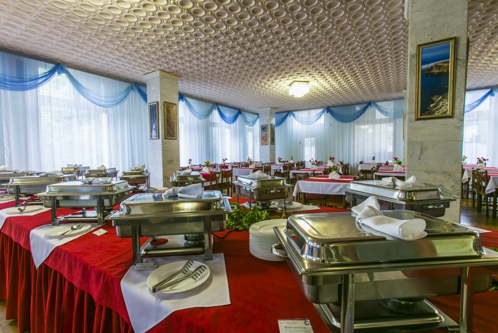 Меню разнообразное, сбалансированное. В его состав ежедневно входят мясо, рыба, молочные продукты, свежие овощи и фрукты, соки, напитки, минеральная вода. Организовано лечебное питание по диетам №№ 5, 7, 8, 9, 10, 15. Прием пищи может осуществляться в четырех комфортных залах на 250 посадочных мест каждый. Обеденные столы на 4 человека. По выбору гостей питание возможно в коммерческом или люкс-зале.