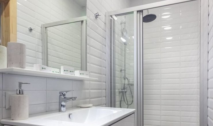 Санузел: с душевой кабиной, тапочки, туалетные принадлежности, фен, халат