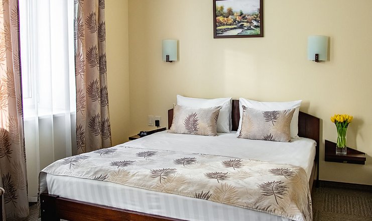 В номере: вешалка, кресло, кровать двуспальная, прикроватные тумбочки, столик журнальный, шкаф, кондиционер, кофемашина: капсульная, телевизор ЖК, телефон, холодильник, чайный набор посуды, электрочайник